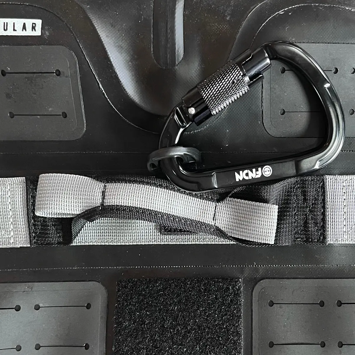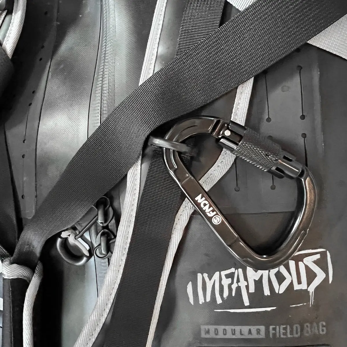 The FNDN® twist-lock auto-locking carabiner is strong, lightweight and compact. The large opening and twist-lock feature allows for easy one handed operation when you need to quickly connect something to your bag or simply hang it in the pits high above the paint and grime.